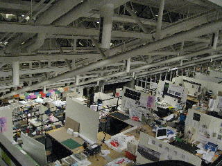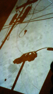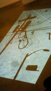 電信柱と空の景色に大量の鳥が飛んできたり、携帯や眼鏡や車が破壊しながら上へゆっくり浮かんでいったりする床に映し出されてるアート