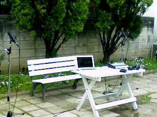 ブログから写真を頂いて、スタジオの庭にて鳥の声収集中の図を紹介します。